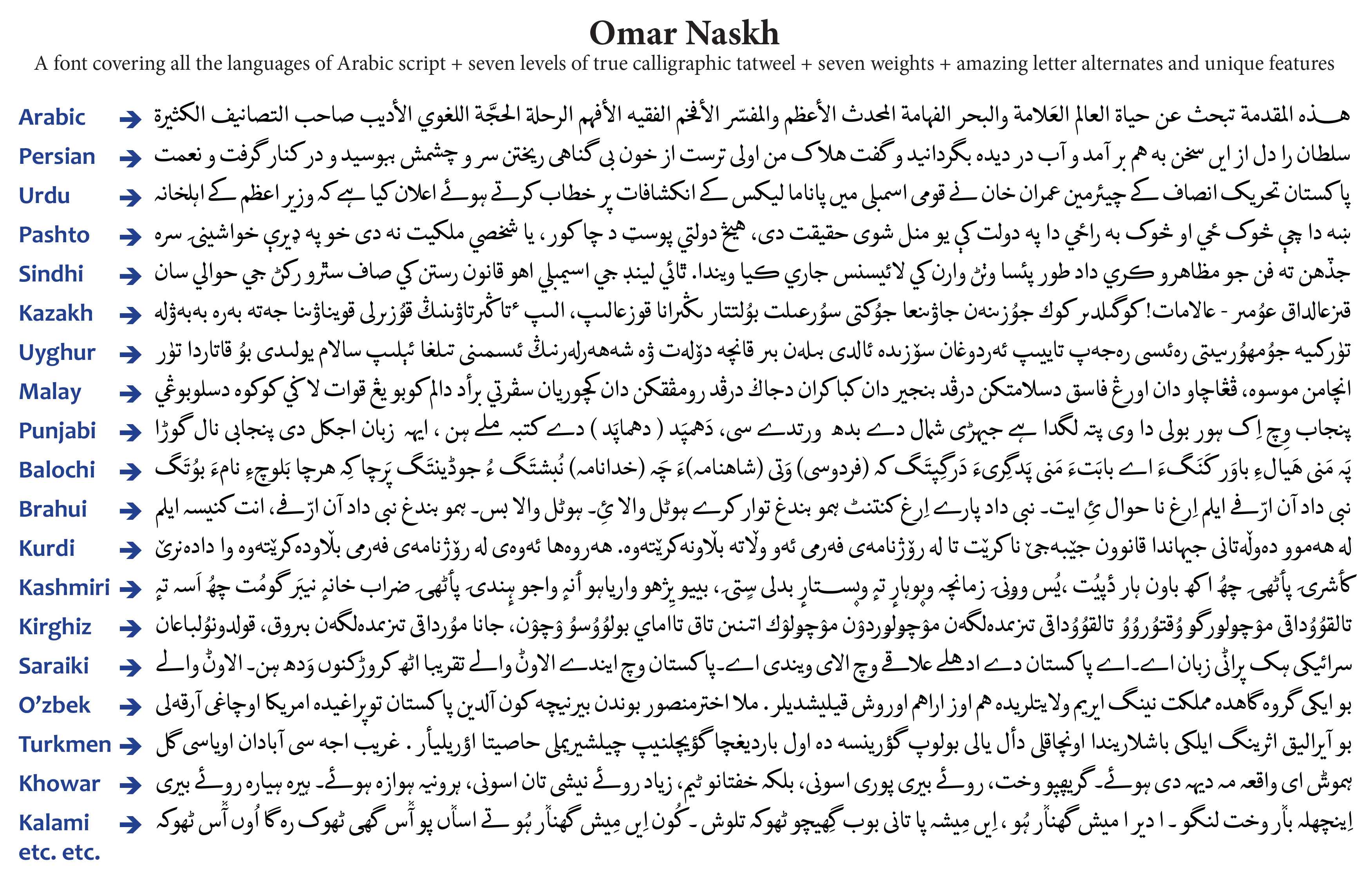 Mencakup berbagai bahasa berbasis aksara Arab (antara lain): Arab Standar Modern, Persia (Farsi), Urdu, Pashto, Sindhi, Saraiki, Kazakh, Uyghur, Punjabi (Jawi/Shahmukhi), Malay (Jawi), Balochi, Brahui, Kurdi (Sorani/Kurmanji), Kashmiri (Koshur), Kirghiz, Uzbek, Turkmen, Gawri (Kalami). Dukungan lintas bahasa menjaga konsistensi visual lintas publikasi dan komunitas.